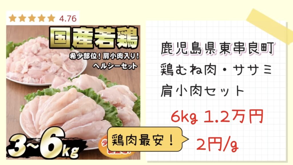 鹿児島県東串良町のムネ・ささみ・肩小肉のセット、6kg 1.2万。