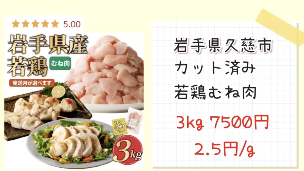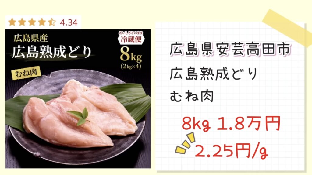 次にコスパがよかった鶏肉はgあたり2.25円の広島県安芸高田市の鶏むね肉、8kg 1.8万。