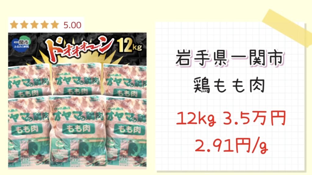 鶏もも肉全体でのコスパナンバー1は一関市の鶏モモ肉12㎏3.5万円。g2.91円でした↓