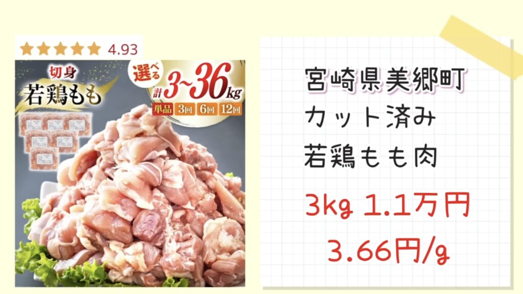 宮崎県美郷町のカット済みもも肉、3kgで1.1万円。