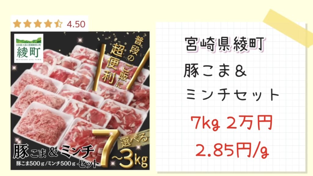 豚肉ジャンルで一番安かったのが宮崎県綾町の豚の切り落としとミンチセット、7kg 2万円。
