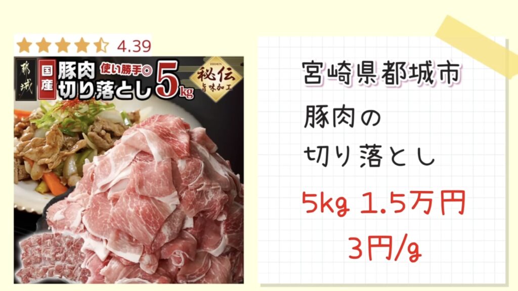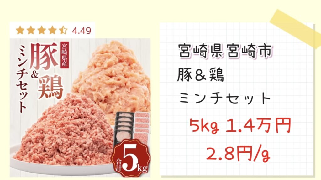 一番安かったのは宮崎県宮崎市の豚&鶏のミンチセット5kg1.4万円、g2.8円。