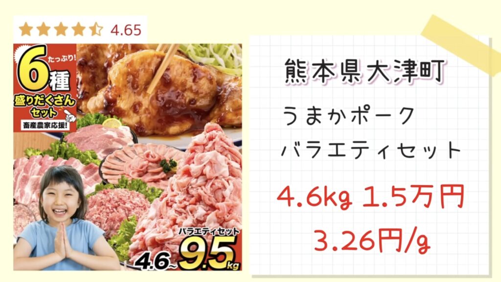 切り落としではなく豚肉の色んな部位を楽しみたい方におすすめなのが、熊本県大津町のうまかポークバラエティセット、4.6㎏1.5万↓