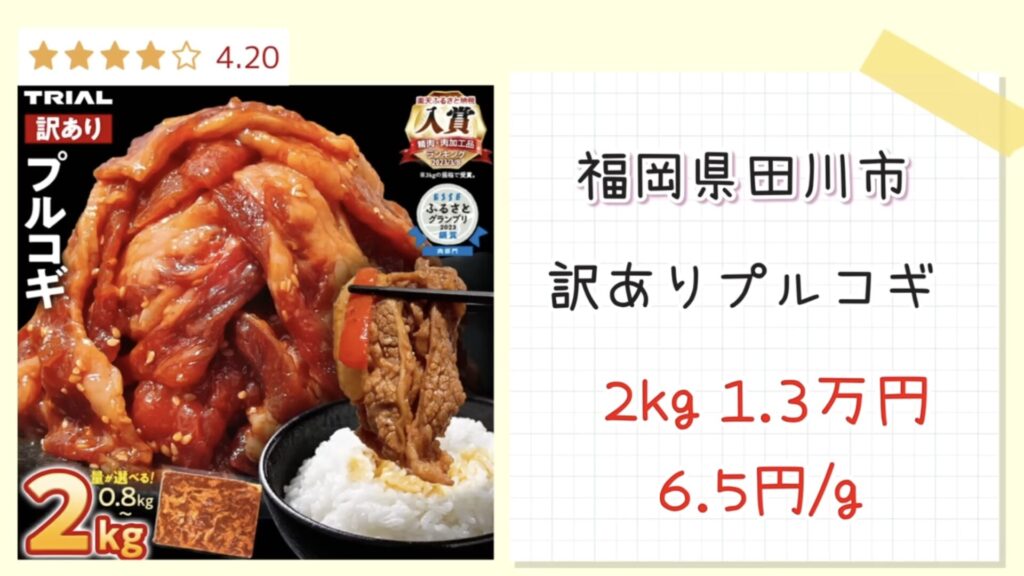 ということで外国産(アメリカorメキシコ産)のお肉ではありますが、牛肉の最安は福岡県田川市の訳ありプルコギ2kg 1.3万円。