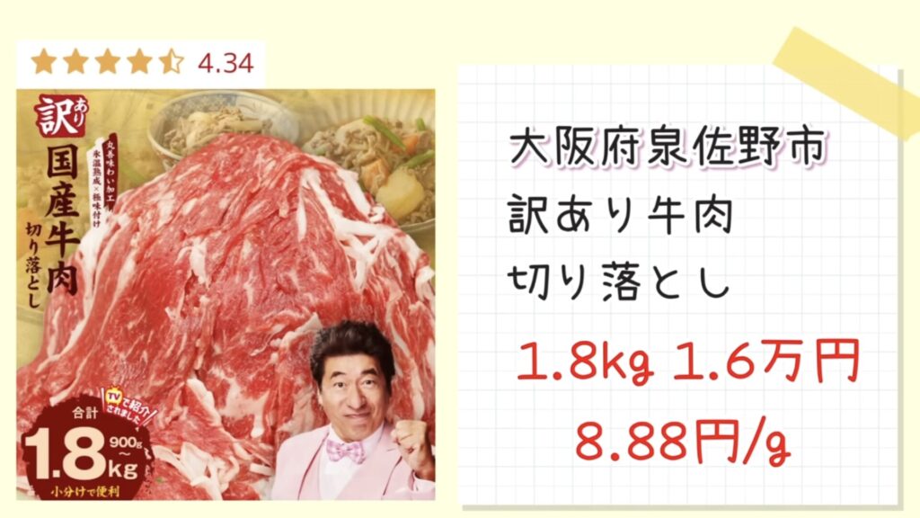 国産で最安の牛肉は大阪府泉佐野市の訳あり牛肉切り落とし1.8kg 1.6万円。1g8.88円。