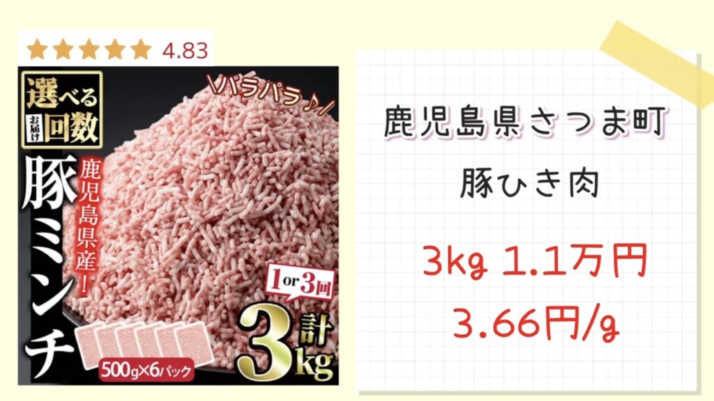 豚ひき肉のみの最安は、鹿児島県さつま町の豚ひき肉3kg 1.1万円。g3.66円。