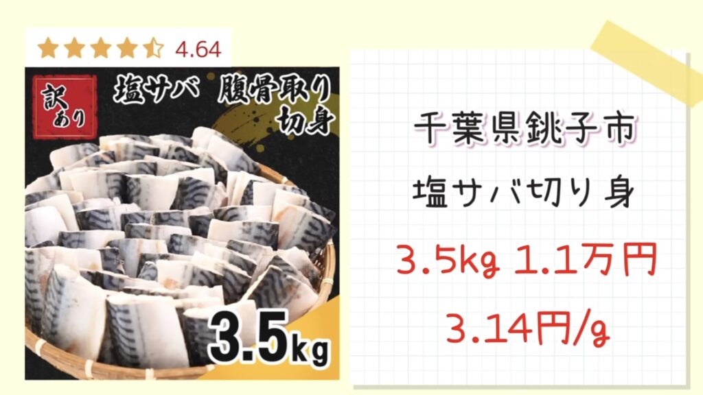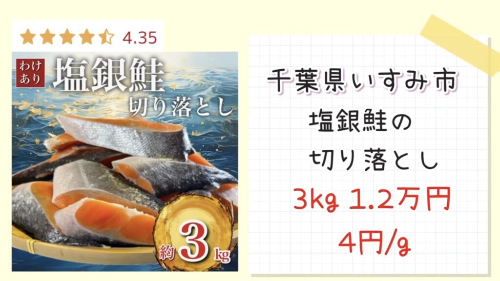 切り身で一番コスパがいいのは千葉県いすみ市の塩銀鮭切り落とし、3kg 1.2万円。