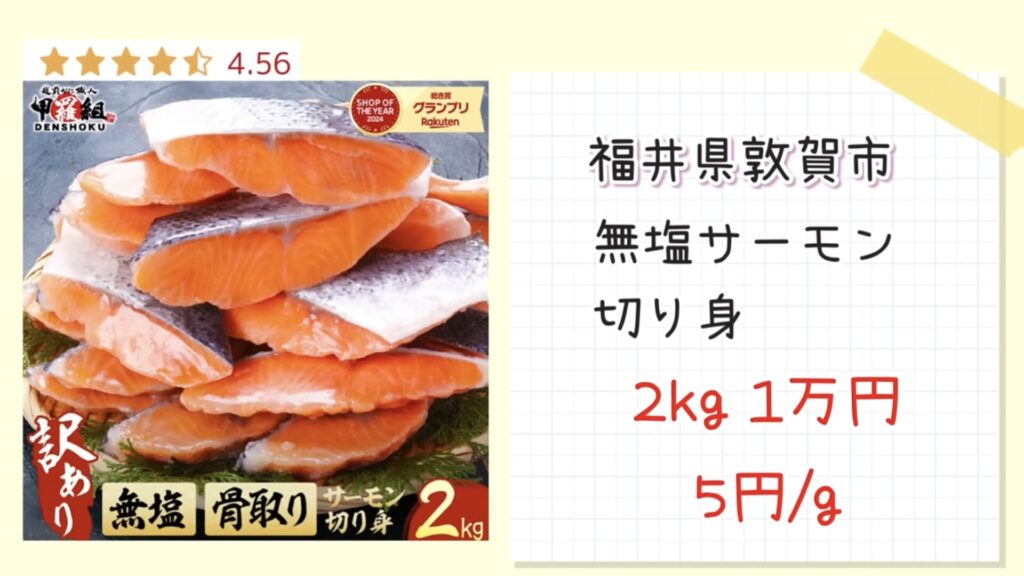 小さい子供がいるご家庭におすすめなのが、福井県敦賀市の無塩サーモンの切り身2kg1万円、g5円。