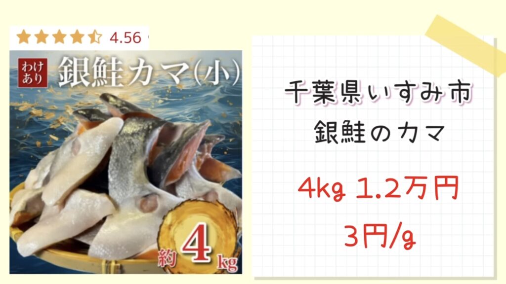 鮭のカマで一番コスパがよかったのは、千葉県いすみ市のもの。4kg 1.2万円、g3円。
