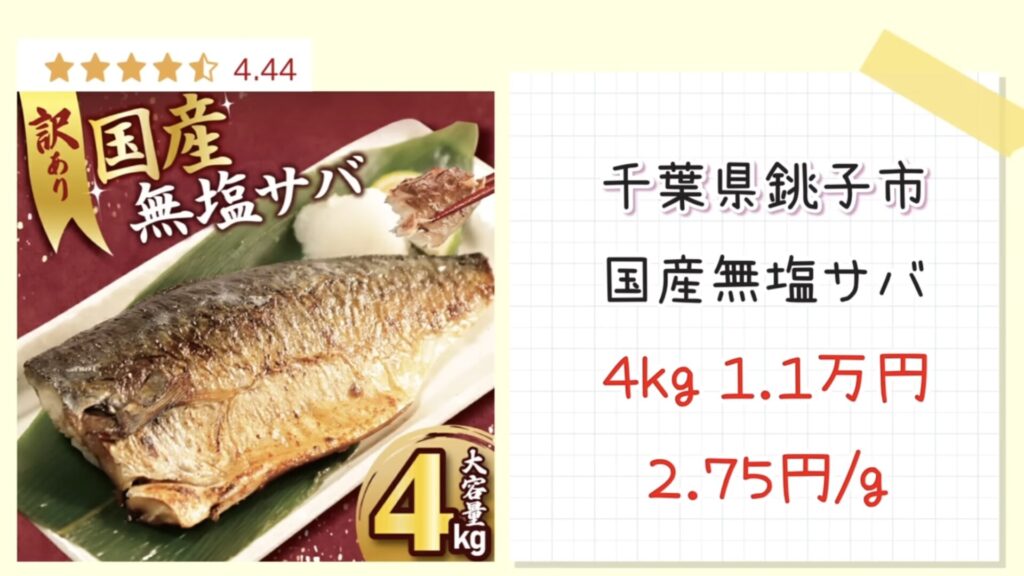 まず国産で最安は4kg1.1万円の無塩サバ。貴重な日本近海産です。