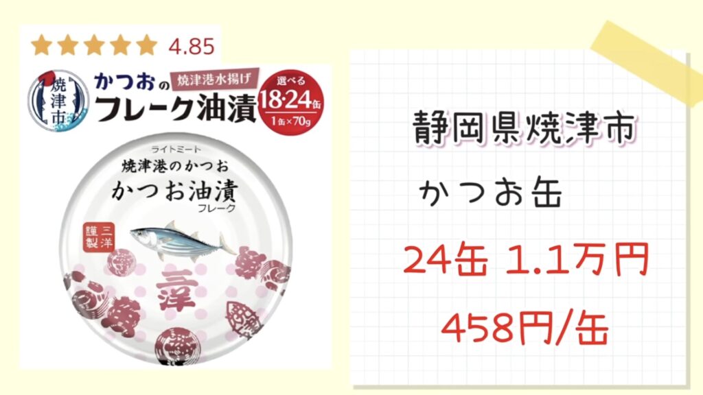 魚のおすすめ最後は、静岡県焼津市のカツオ缶24缶で1.1万円。