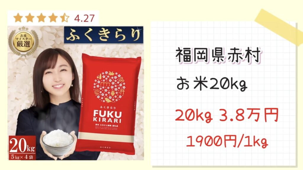 続いてお米。一番コスパがいいものは福岡県赤村のこちら。20kg 3.8万円。