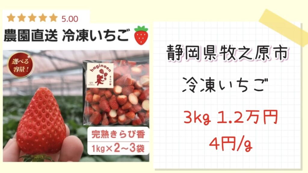 おすすめの食品ラストは静岡県牧之原市の冷凍いちご、3kg 1.2万円。