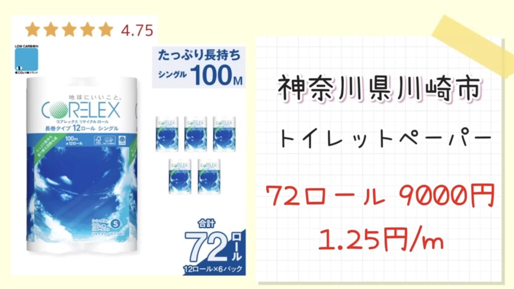 1つ目は神奈川県川崎市のトイレットペーパー、72ロール9000円(シングル・ダブルあり)
