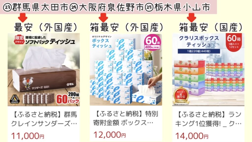 箱ティッシュだと大阪府泉佐野市の60箱1.2万が安いです↓