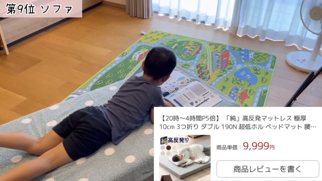 高反発マットレスは水分がしみこむと全然乾かないので処分しようかと思ったんですが、おねしょが染み込んだ所だけ切り離して、二つ折りの簡易ソファーとして活用することにしました。