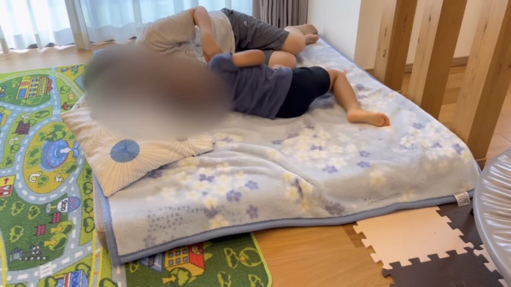 広げると寝ころぶこともできるし、こどものお昼寝にも便利。ソファより寝心地も良い!