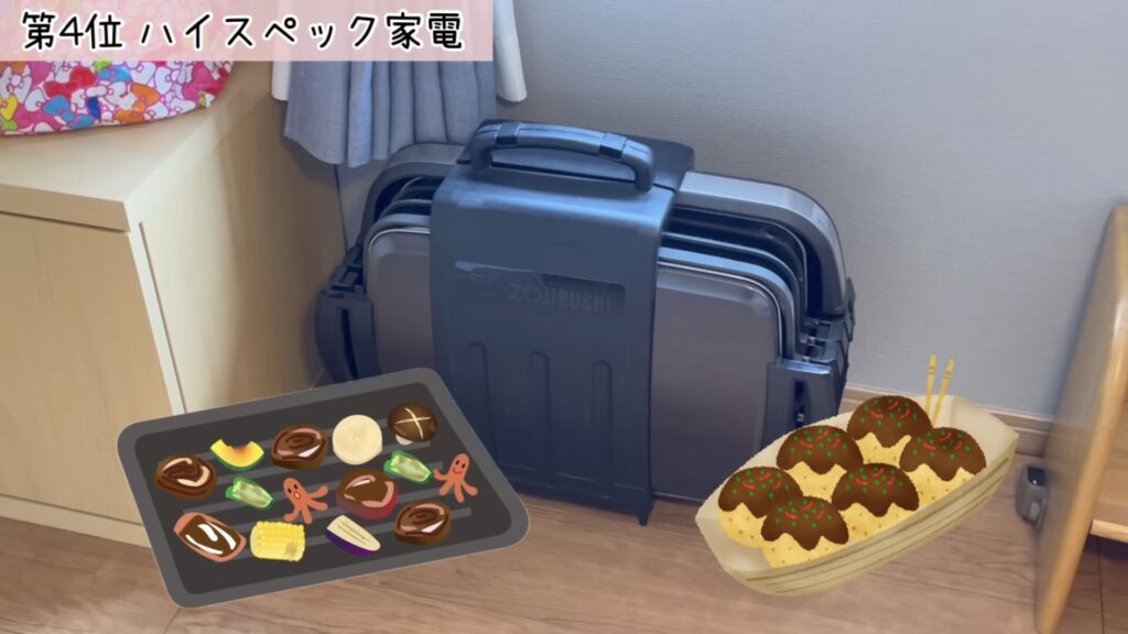 焼き肉をするとき油が下に流れるので美味しく焼けるし、たこ焼きなど色んなプレートがついているもので、以前夫が一目ぼれして家電量販店で買ってきました。